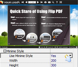 If you want to present Page-flipping eBook pages directly without showing toolbar, especially when you want to embed eBook into a small area in existing webpages, then you can use this "Minime Style"