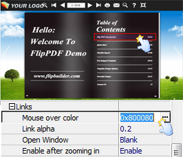 If you have check "Import links" option in "Import PDF" interface, you can define links "Mouse over color", "Link alpha" (refers to the link area opacity), and "Open Window->Blank/ Self".
