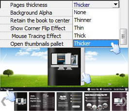 To make pages look thin, thinner, thick and thicker even none thickness effect of flip book. And you can choose to open thumbnails pallet when open the book.