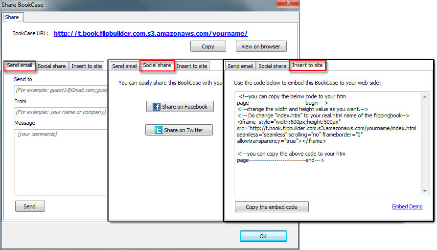 After uploading successfully, you can click "Share" to share your BookCase with others via email, or through social share websites, or copy the Embed Code to insert into other webpages.