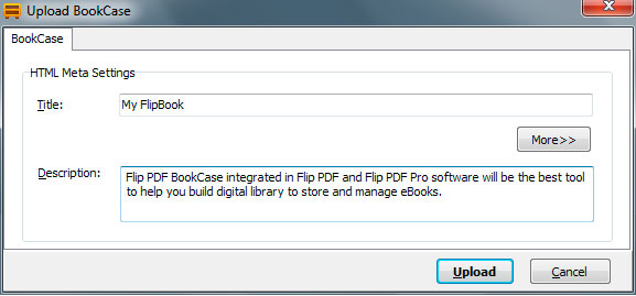 After designing your BookCase style, you can click "Upload Online" button to upload your BookCase onto FlipBuilder website server directly. Define "Title" and "Description" and then click "Upload" to publish: