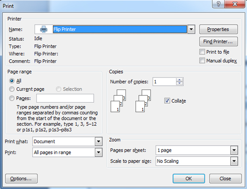 After opening the file you want to print into page-flipping eBook, click "Print" command, then you will enter into the Choose Printer interface (here take Word 2007 print interface as reference):