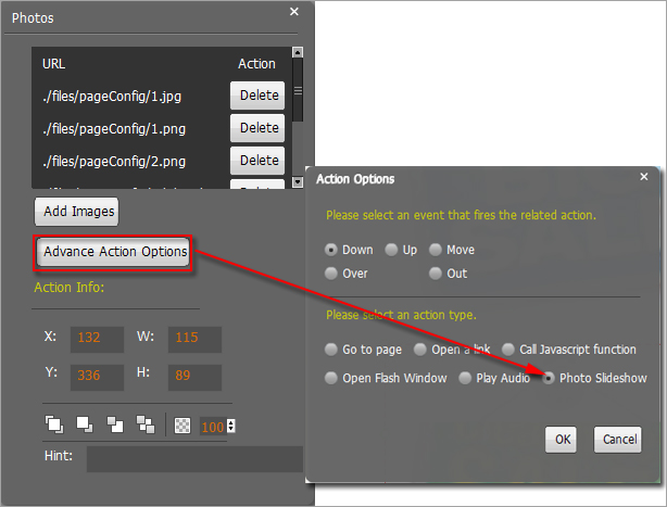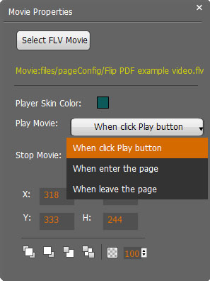 to draw an area for inserting your image or SWF button file with calling actions. The actions contain "Go to page", "Open a link", "Call Javascript function" and "Open Flash Window". The before three actions are the same with the actions in "Add Link", the "Open Flash Window" can help you to play SWF Flash or FLV Video in the pop-up window: