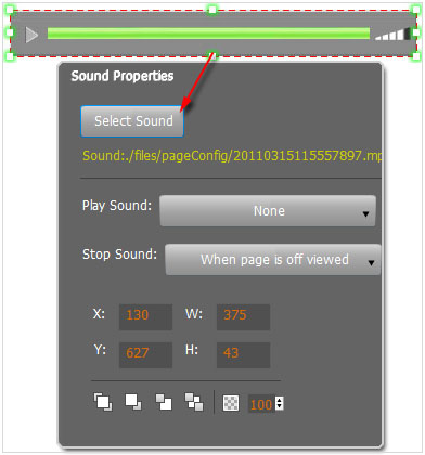 to draw sound box and then select sound file, set other options: