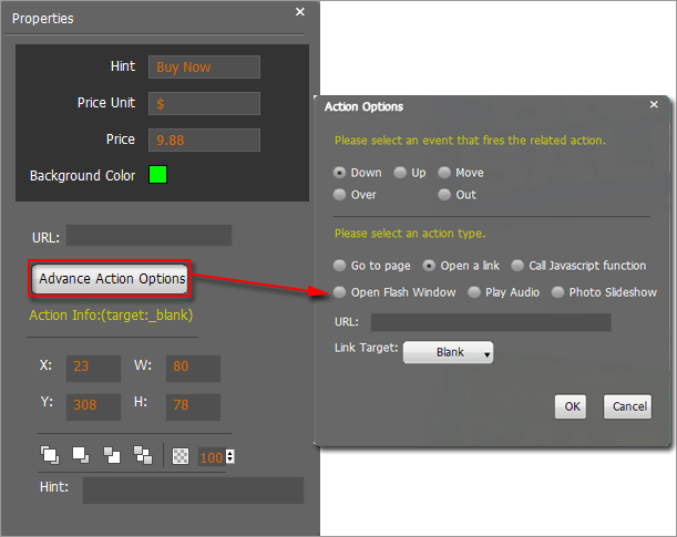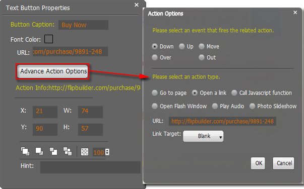 Define Button Text, set link URL, there are many different action options, like Go to page, Open a link, Call Javascript function, Open Flash window, Play Audio and Play Slideshow.