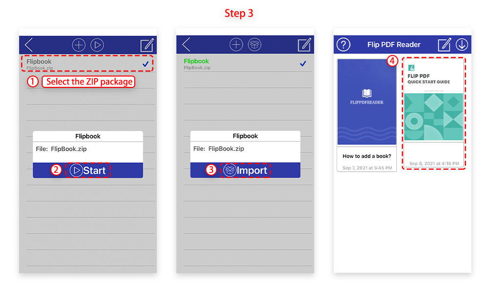 (3) Select the ZIP package > Click [Start] to download > Click [Import] to import the flipbook to the bookcase